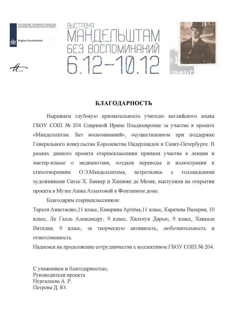 Организаторы проекта "Мандельштам. Без воспоминаний" при поддержке Генерального консульства Королевства Нидерланды в Санкт-Петербурге прислали в адрес учителей и учащихся